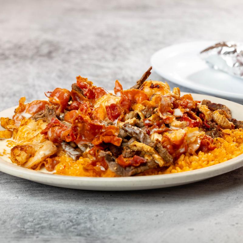 Grilled chicken, steak, shrimp, and bacon. Served on a bed of rice topped with cheese dip and 3 tortillas.