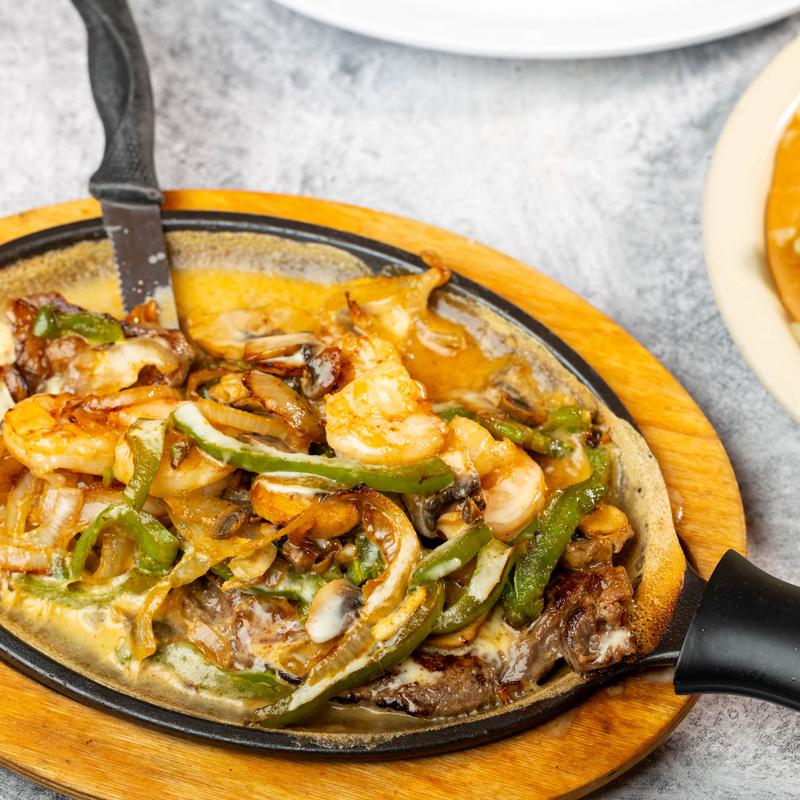Rib-eye steak topped with onions, bell pepper, mushrooms, shrimp, and melted cheese. Served with rice, beans, lettuce,and pico de gallo. 3 tortillas.