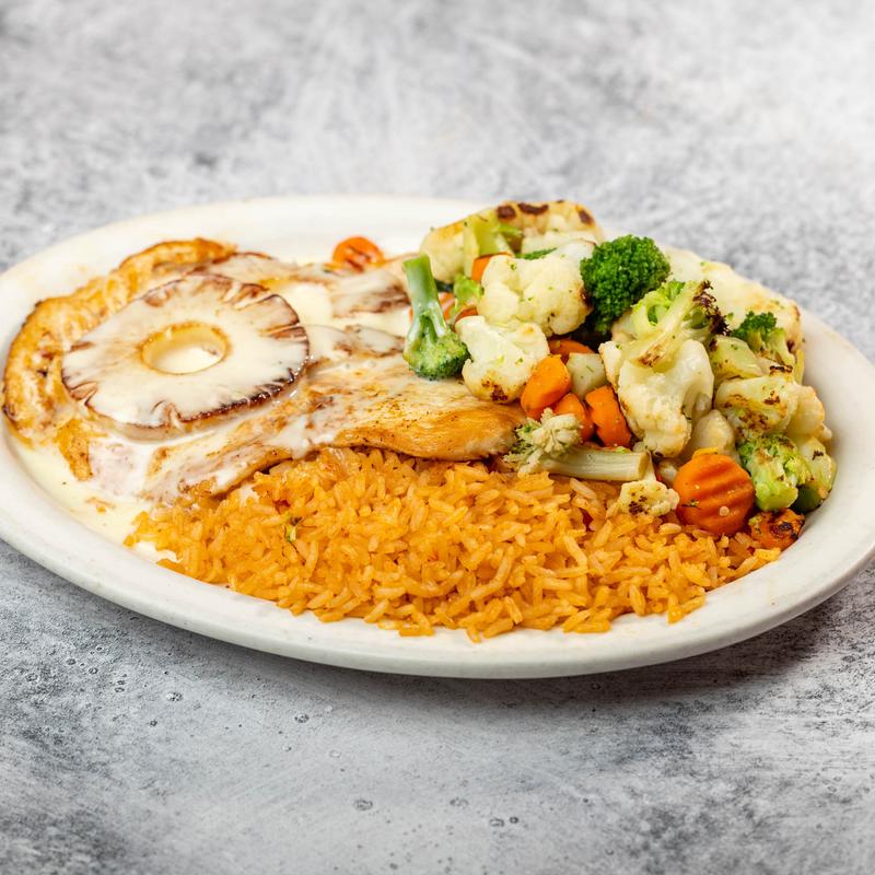 Grilled chicken breast with pineapple on top. Served with rice, broccoli, cauliflower, carrot, and topped with cheese dip. 3 tortillas.