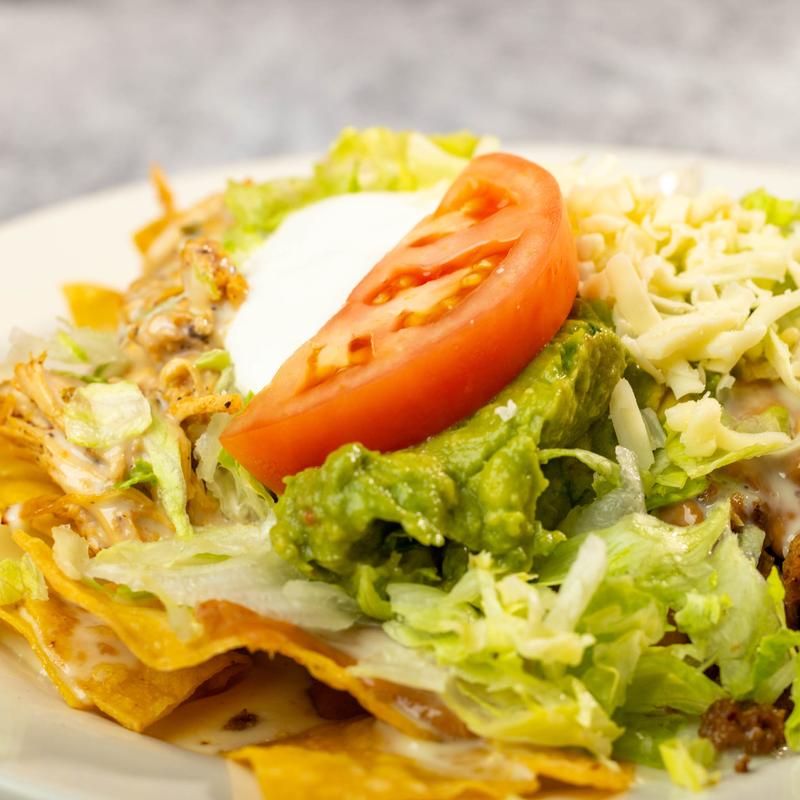 Topped with chicken, beef, beans, and cheese dip. Lettuce, Tomatoes, guacamole and sour cream, and cheese.