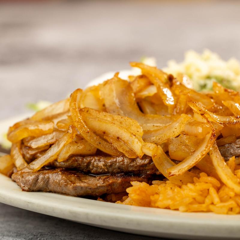 Rib-eye steak topped with grilled onions. Served with rice, refried beans, lettuce, and 3 tortillas.