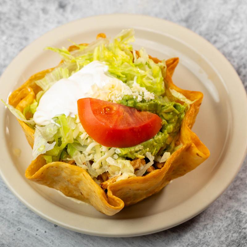 Crispy flour tortilla with chicken or beef, lettuce, tomatoes, cheese, and sour cream.